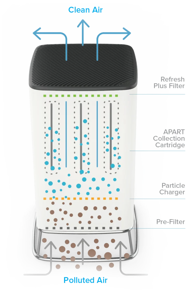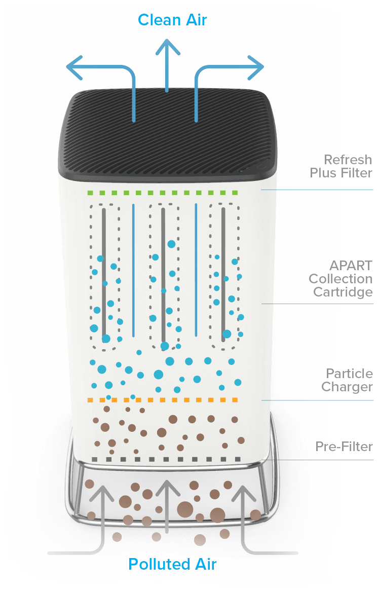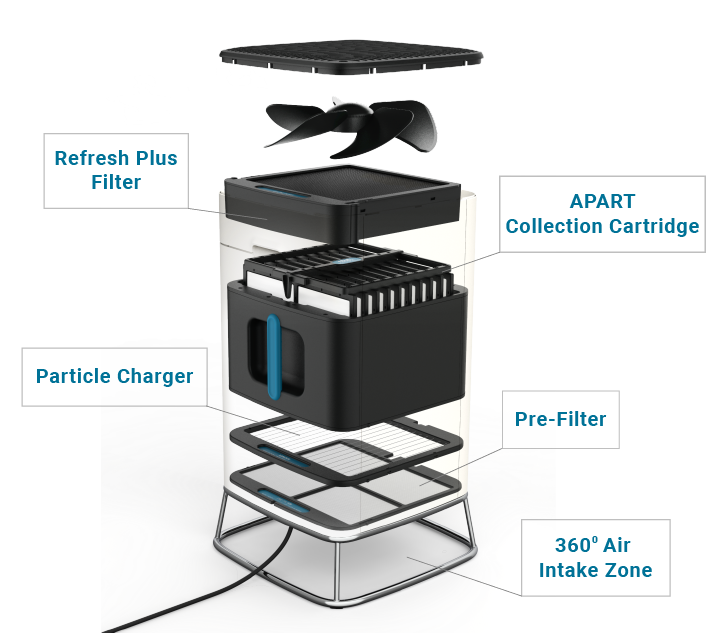 Developed by research scientists and technologists at the University of Washington’s Sensors, Energy, and Automation Laboratory, patented Advanced Particle Removal Technology (APART™)APART technology pairs particle-repelling plates with disposable particle-collecting plates. The innovative design removes fine and ultrafine particles without clogging or reducing the airflow.