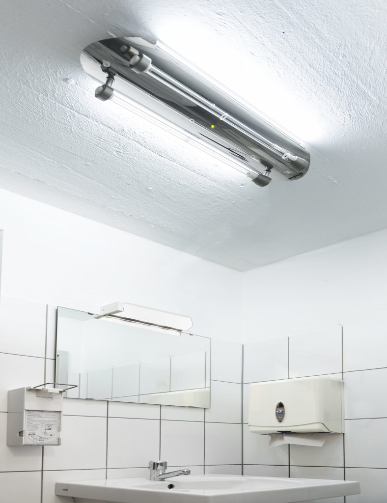 The NIX30-1 is the most compact device of the NIX product line with 30W lamp power. This UV-C light is most appropriate for narrow installation, e.g. in cabinets, in front of humidifiers, etc. Because this device does not contain a protective reflector, both air and surfaces are decontaminated.
